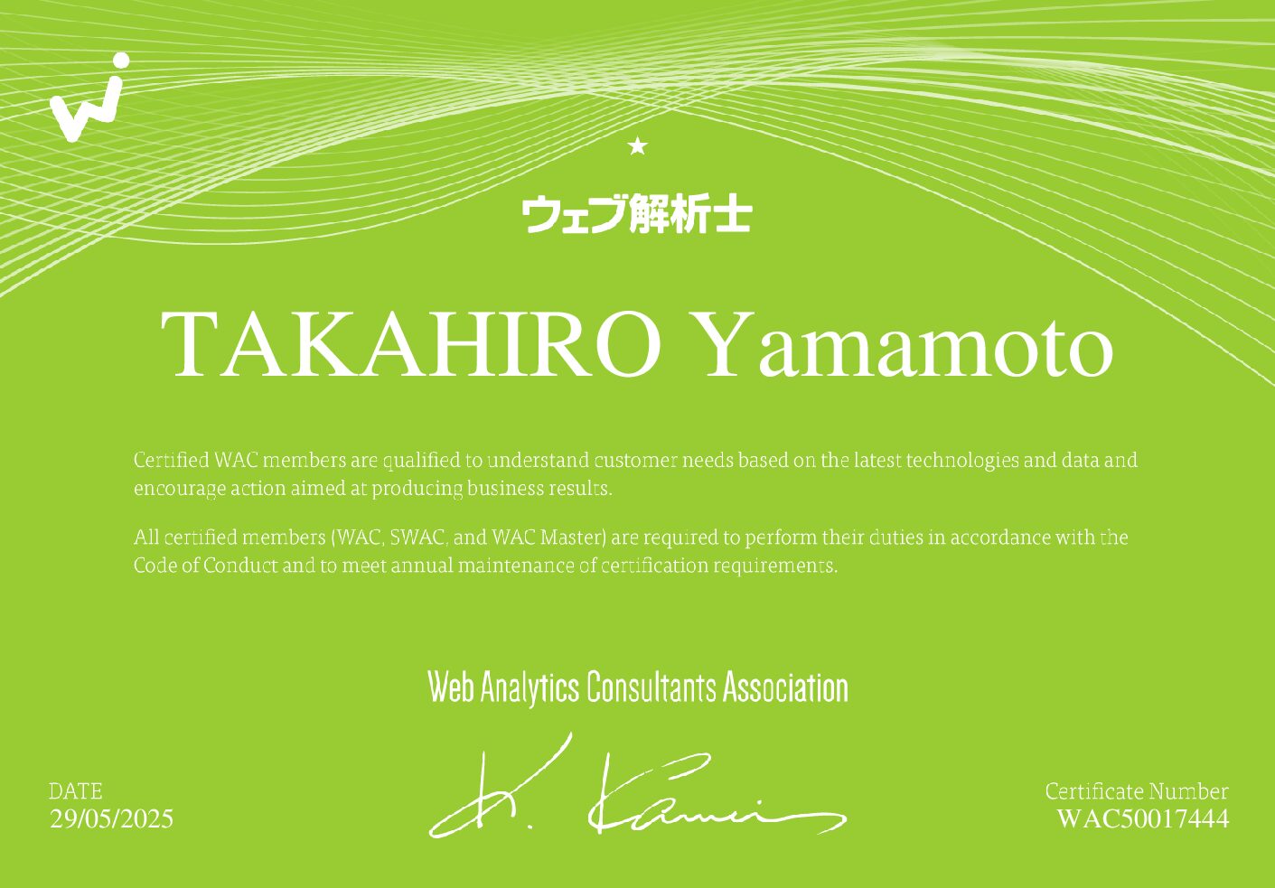 一般社団法人ウェブ解析士協会(https://www.waca.or.jp )が認定するウェブ解析士の試験で1名の合格者(認定)がありましたのでお知らせします。あわせて一般社団法人ウェブ解析士協会の正会員で参画しました。